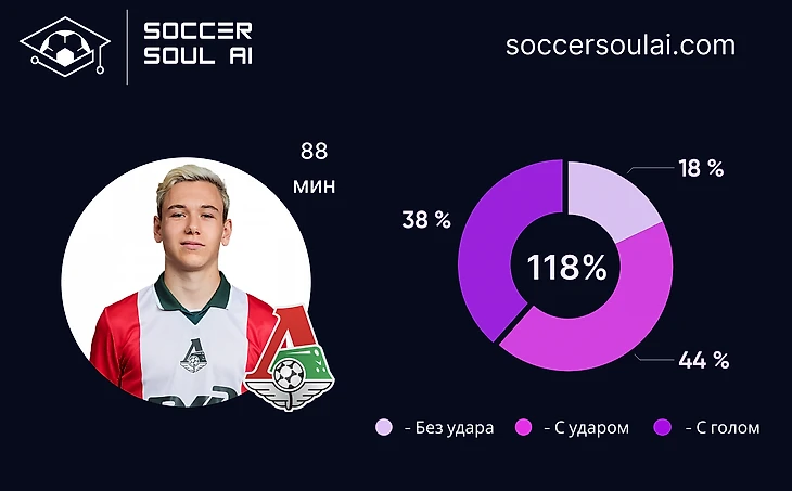 После завершения первой трети чемпионата можно уверенно констатировать, что Батраков – важная составляющая общего качества командной игры Soccer IQ 118% - лучший показатель игрового интеллекта в Локомотиве. При этом на позиции атакующего полузащитника он вырастает до 159%. 82% АВП-баллов Батракова набраны в атаках завершившихся ударом, 38% - ГОЛОМ!