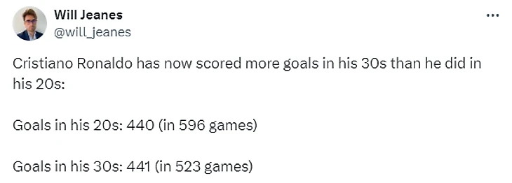 Британский журналист The Athletic Уилл Джинс посчитал, что четвертый десяток для Роналду выдался по голам куда продуктивнее, чем третий.