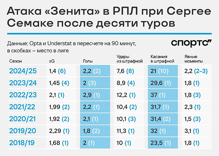 С одной стороны, «Зенит» – самый эффективный на чужой половине и выжимает максимум из моментов. С другой – никогда не создавал так мало. Даже в первые сезоны Семака – в более закрытой РПЛ и с меньшим запасом прочности.