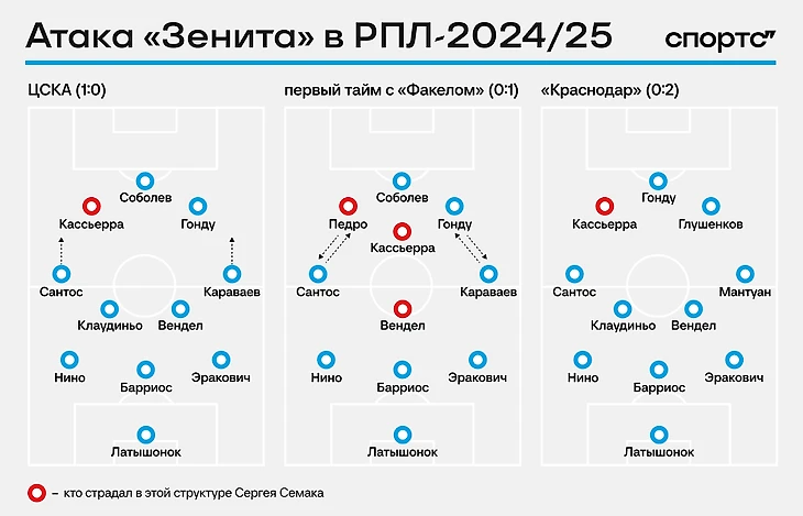 «Зенит» провалил два подряд первых тайма. С «Краснодаром» Семак выпустил Кассьерру слева, Гонду впервые сыграл в центре, а Глушенков вернулся направо.