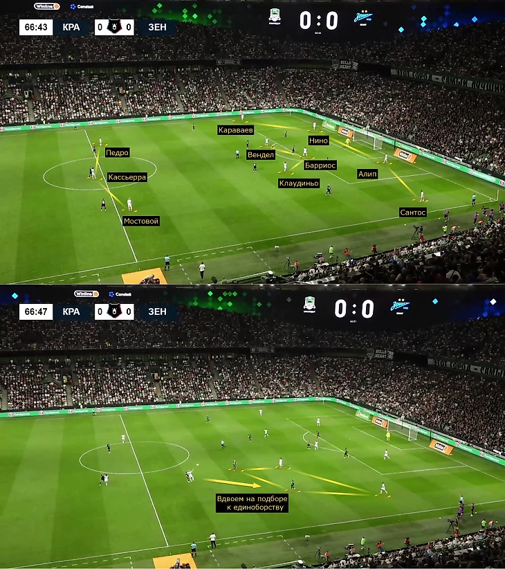 – с «Факелом» Кассьерра, сыгравший под Соболевым, снова потерялся между линиями, а единственный разыгрывающий полузащитник Вендел разрывался между помощью защитникам, продвижением и подыгрышем. При выходах из оборону в атаку вингер Педро спускался на позицию восьмерки – прессинг соперника сильно его ограничивал;