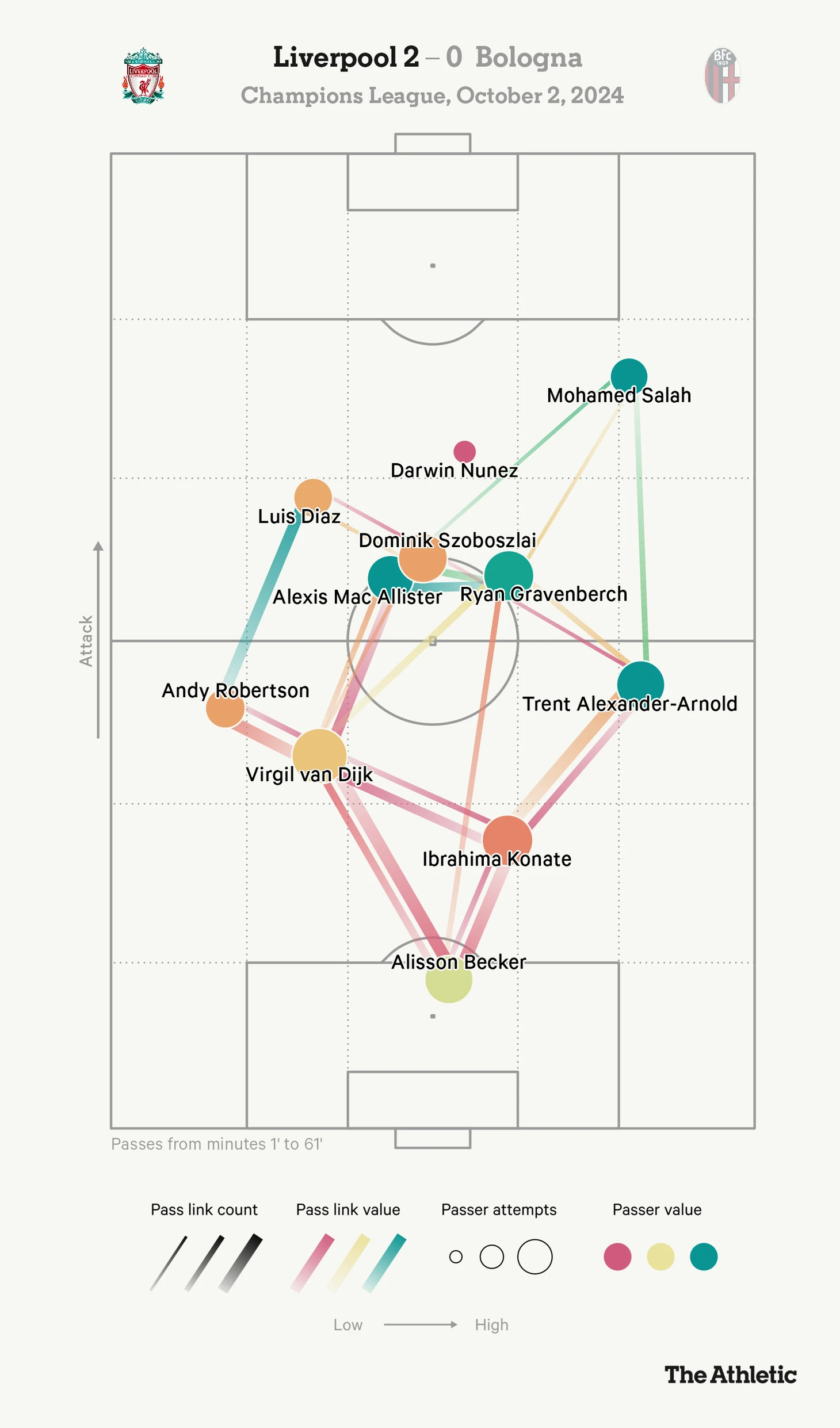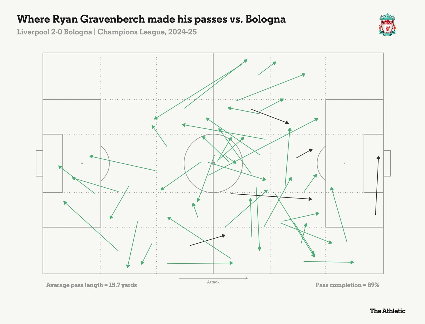 С тех пор как новый главный тренер перевел его в основу полузащиты «Ливерпуля», он стал значительно лучше. Его умение действовать в узких зонах сыграло решающую роль в том, что команда Слота не была подавлена системой «Болоньи». Он продолжал гнать хозяев вперед.