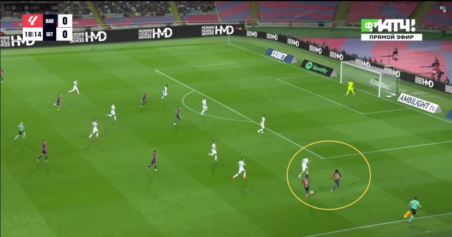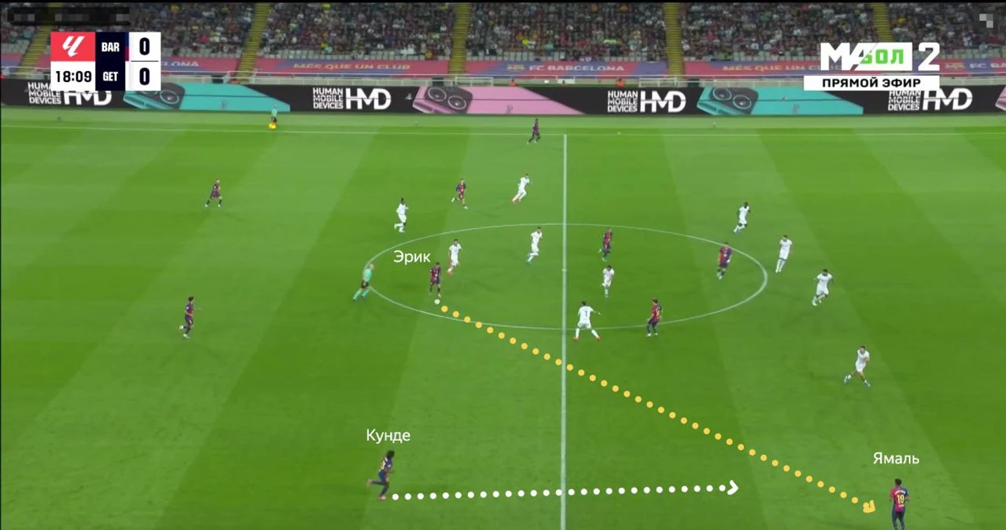 Например, гол в ворота «Хетафе» в недавнем матче пришел именно после взаимодействия этой пары игроков. Ламин получает мяч в широкой позиции, Кунде открывается под передачу вдоль в фланга. Достаточно простой, но действенный прием.