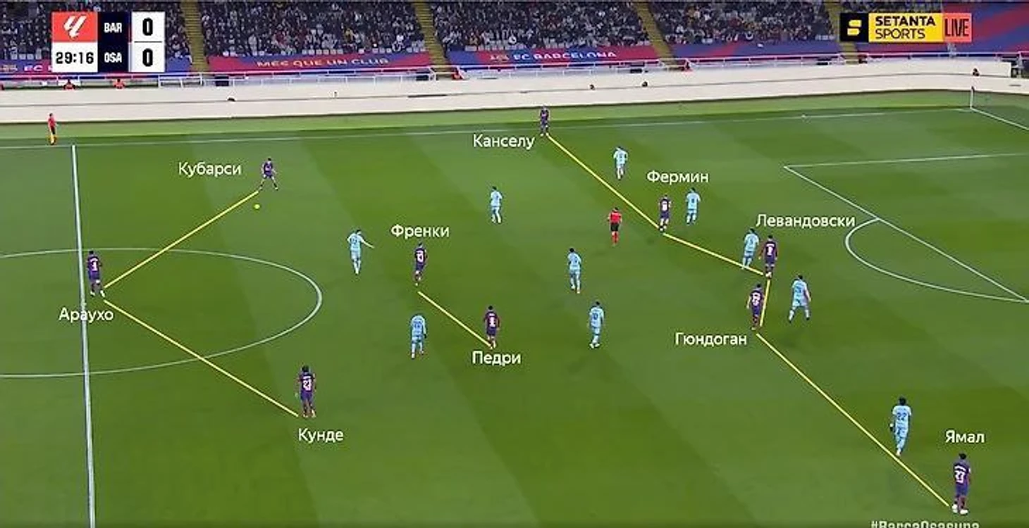 В ситуациях, когда Кунде подключается вперед, он вынужден делить одну зону с Ламином Ямалем. Здесь важно то, что оба готовы адаптироваться под расположение друг друга. Не возникает ситуации, когда один всегда держит ширину, а другой располагается в полуфланге.