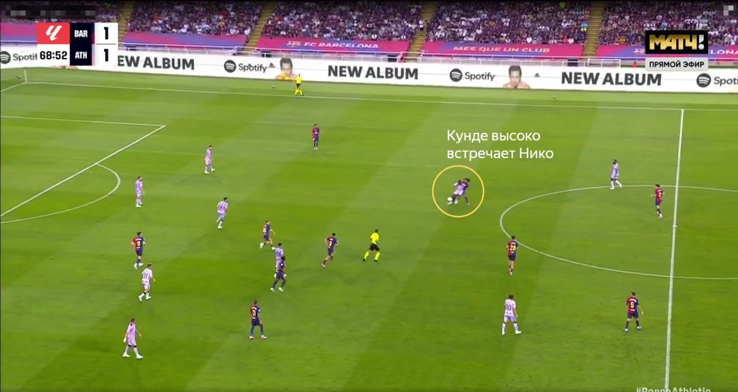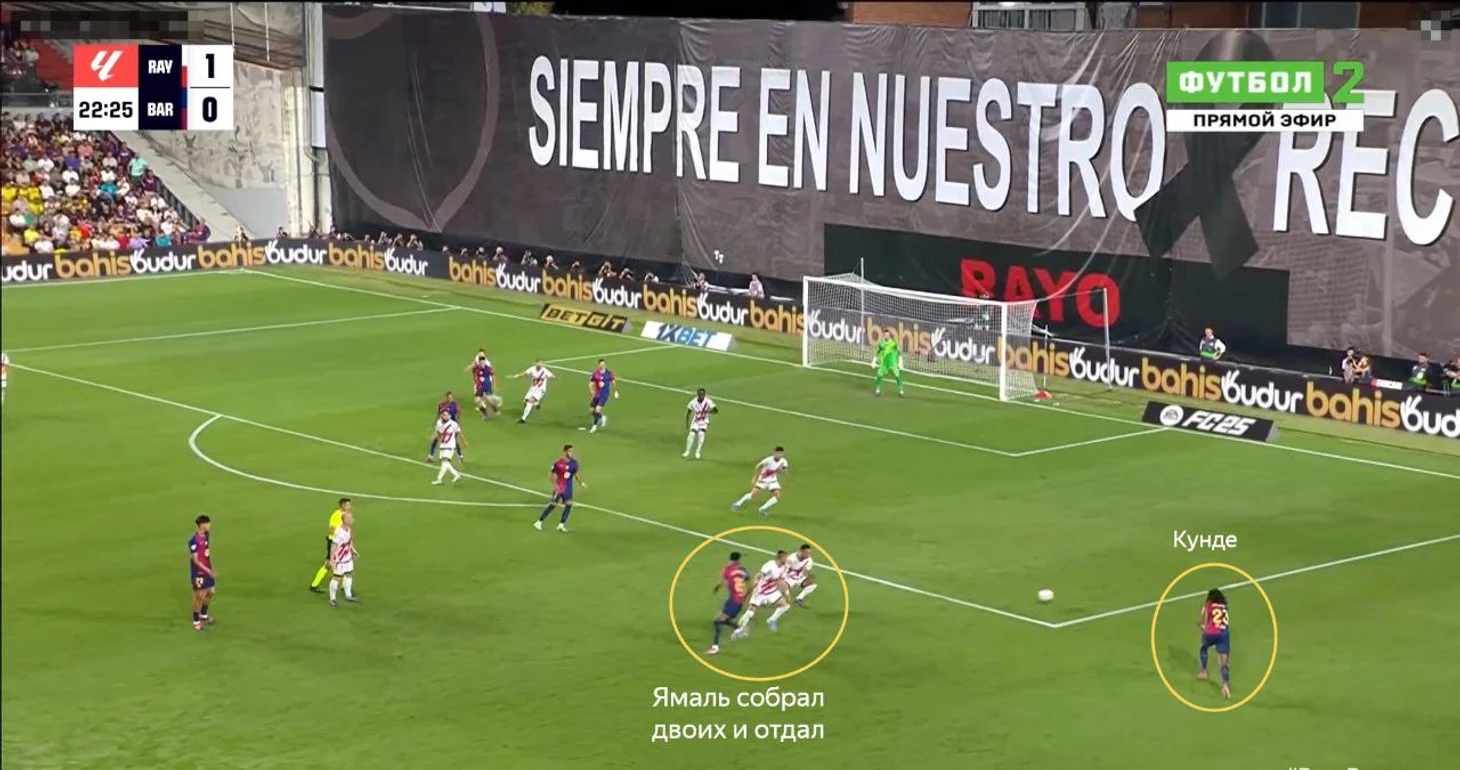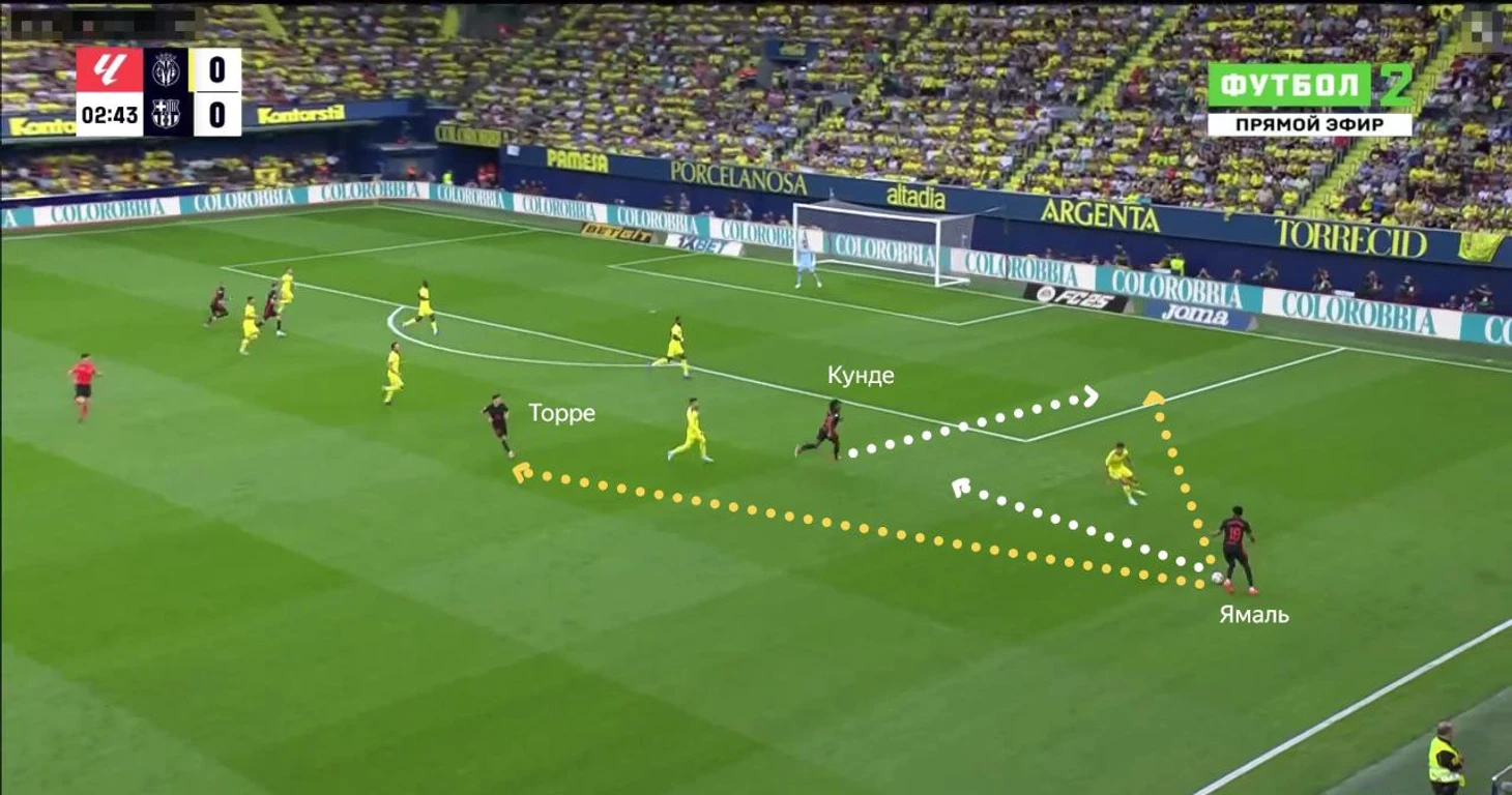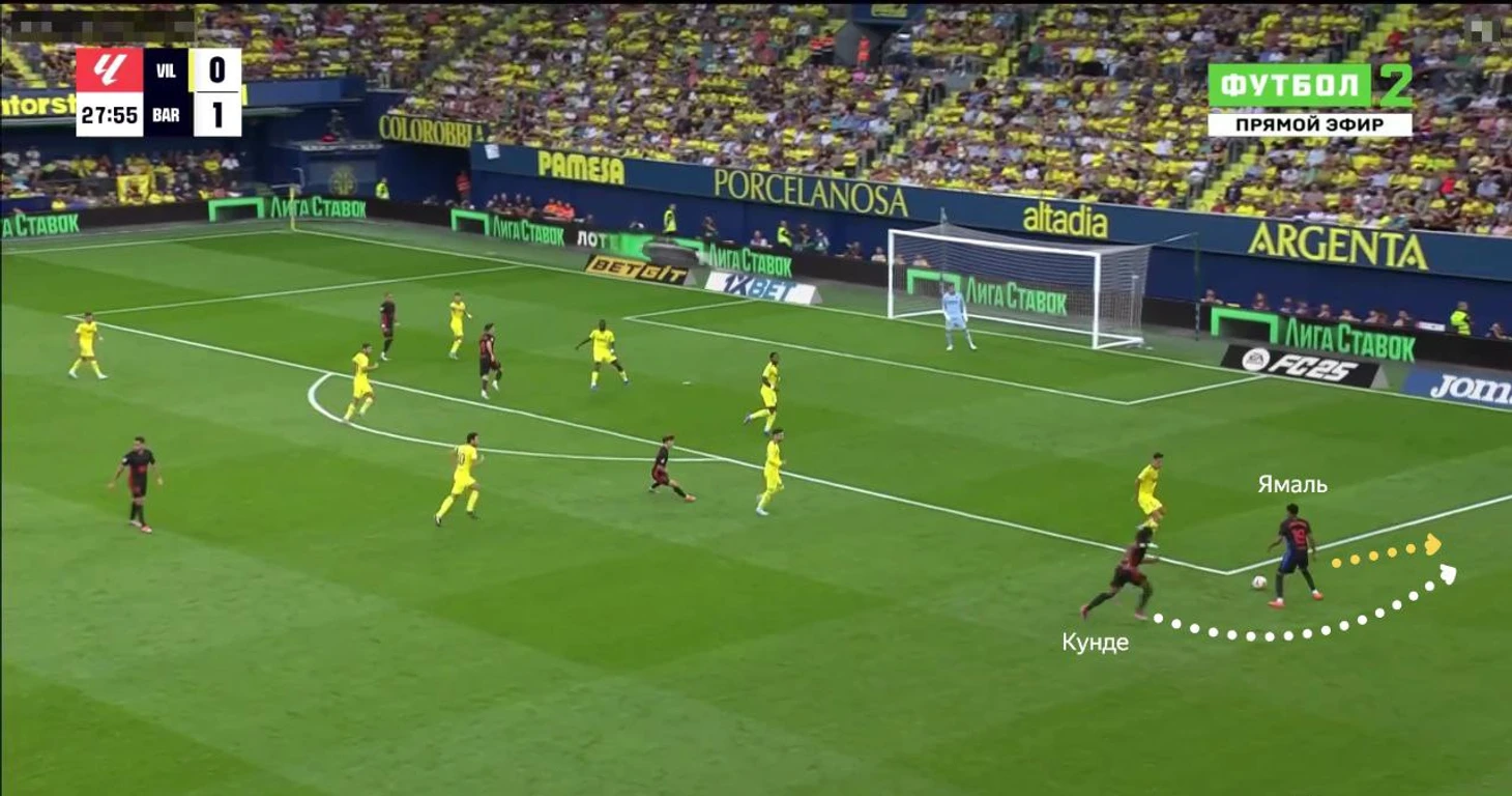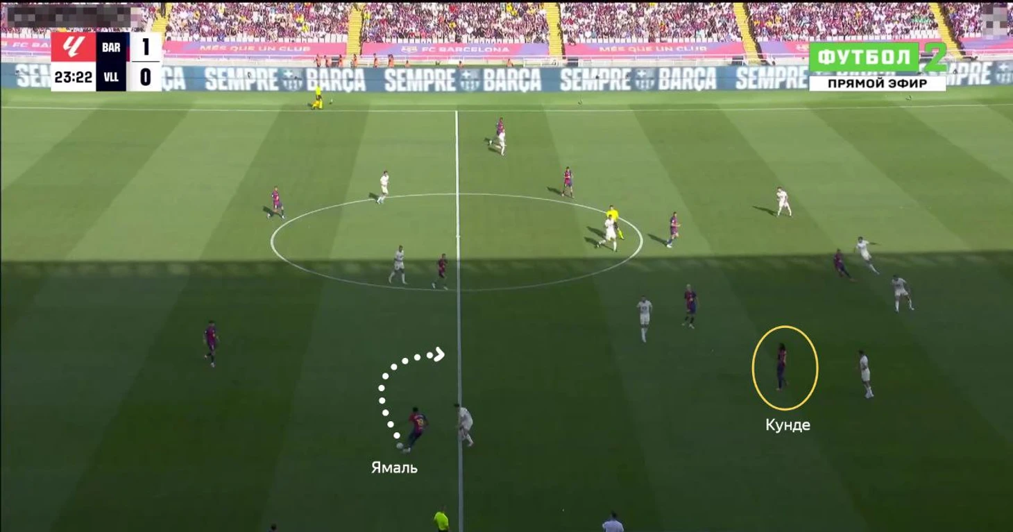 Это достаточно энергозатратная роль, которая требует не только тактической, но и физической подготовки. Ситуация становится еще сложнее, так как на правом фланге действует не самый сильный в игре без мяча Ламин Ямаль, что еще больше осложняет задачу Кунде.