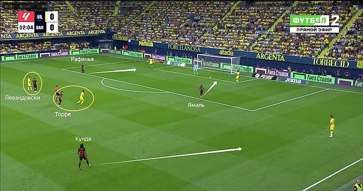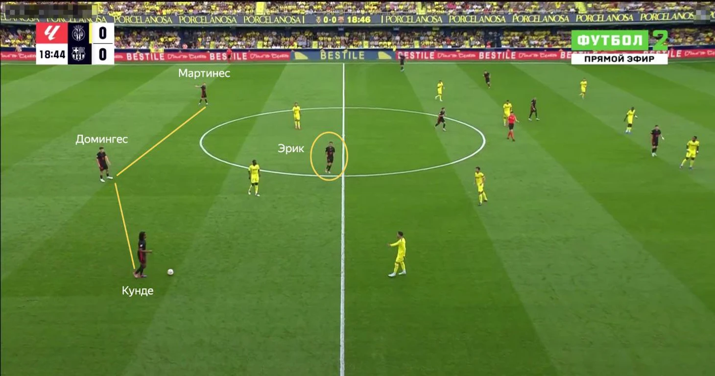Здесь (наоборот) Кунде делает рывок в полуфланге и освобождает Ламину пространство для смещения в центр. Подробнее такой тип взаимодействия описывал в тексте по матчу с «Вильярреалом».