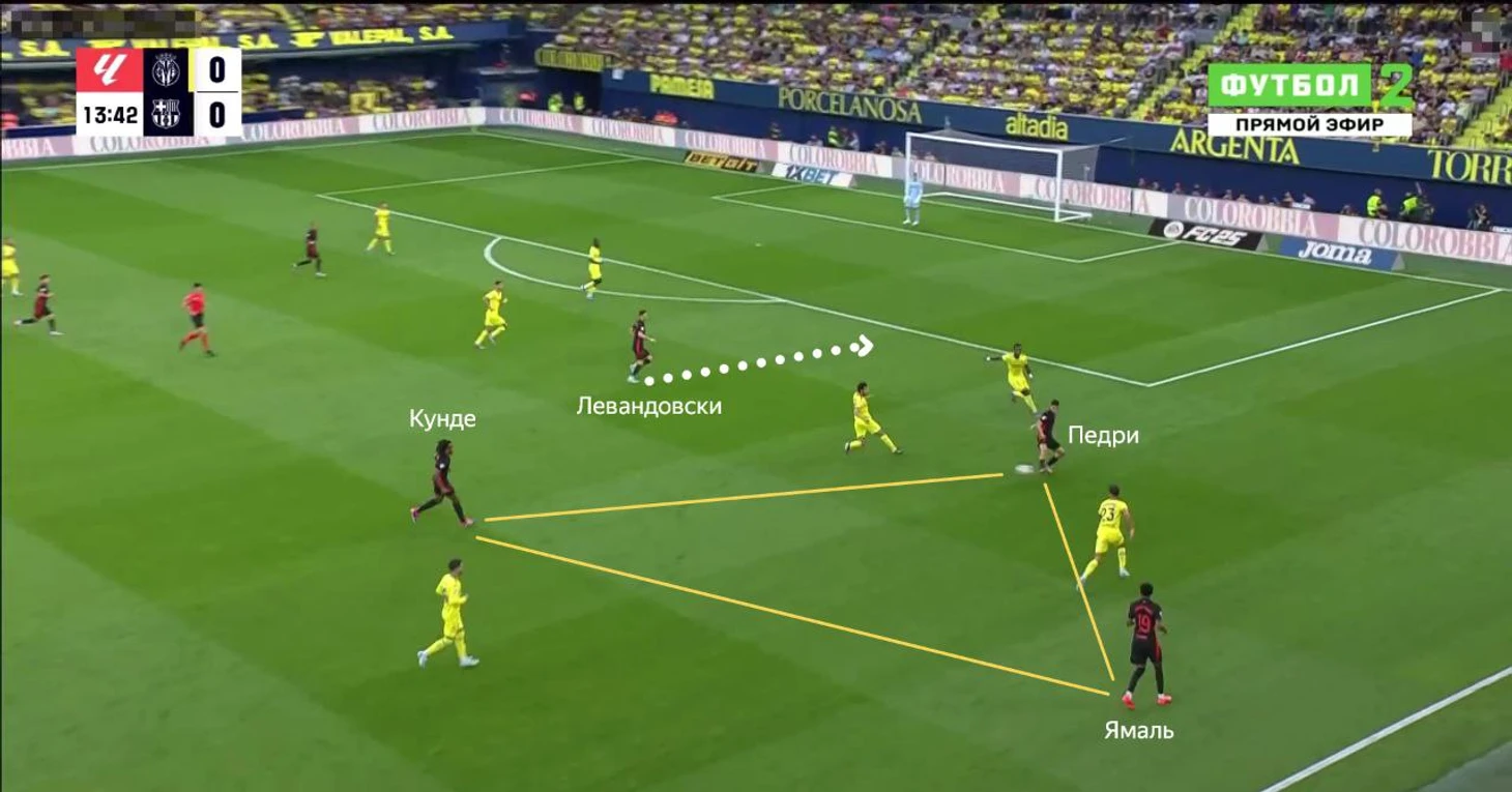 Футболисты могут комбинировать несколько вариантов, что делает их менее предсказуемыми. Например, здесь Кунде подключается из-за спины Ямаля и создает ему опцию для передачи вдоль поля.