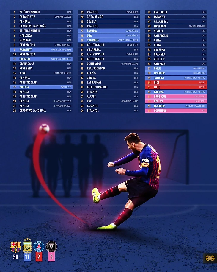 50 голов со штрафных Лионель Месси забил за «Барселону», одиннадцать − за сборную Аргентины, три за «Интер Майами» и два за «ПСЖ».