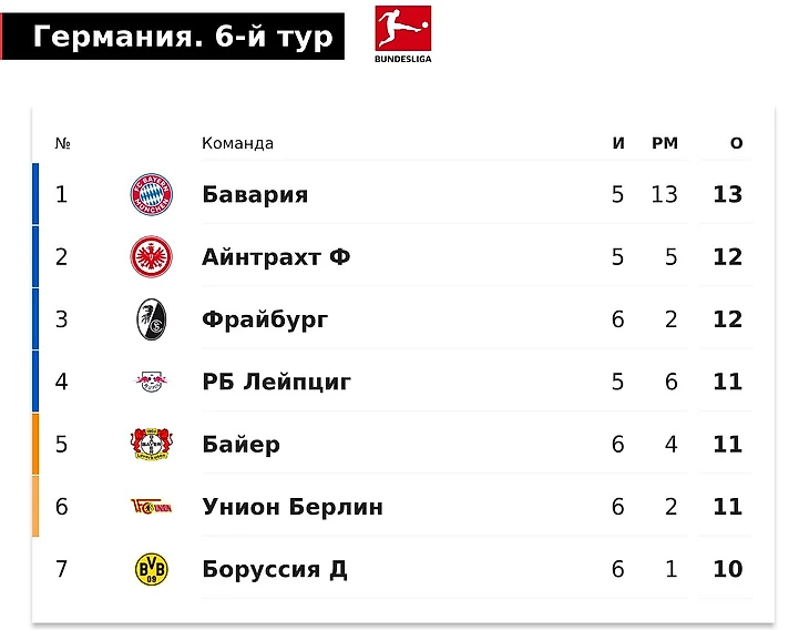 Прошло только шесть туров, но пока «Байер» и «Дортмунд» качает, в лидерах «Айнтрахт», «Фрайбург» и «Унион». Здесь же «Лейпциг».