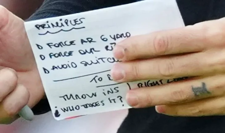 Первая записка гласила: «Форсировать AR (attacking returns – возвраты мяча, которые приведут к атаке) на 6 ярдов». Шесть ярдов – один из размеров штрафной площади.