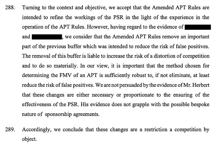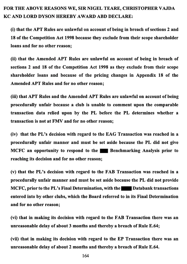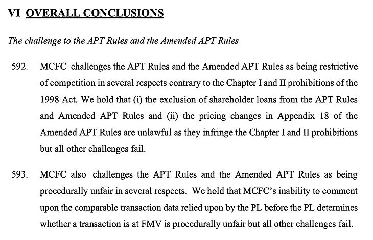 «Клуб добился удовлетворения своего иска: правила о сделках с ассоциированными сторонами (APT), были признаны незаконными, а решения Премьер-лиги по двум конкретным спонсорским сделкам «Манчестер Сити» были отменены. Суд постановил, что как первоначальные, так и текущие измененные правила APT нарушают законодательство Великобритании о конкуренции и требования процедурной справедливости.