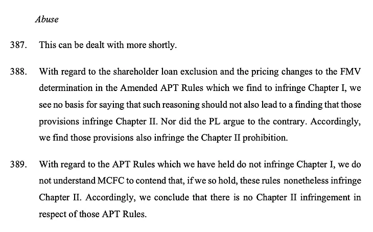 В пункте 388 комиссия признает, что исключение кредитов владельцев из фискальной отчетности клубов, а так же изменение правил оценки FMV является нарушением закона Великобритании о честном соревновании.
