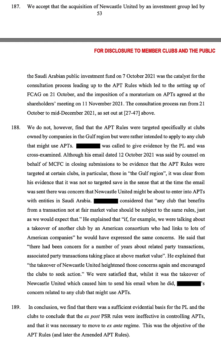Пункт 187 – Комиссия признает, что приобретение Ньюкасла Саудовским инвестиционным фондом стало триггером для разработки и ввода в действие поправок к ФФП о спонсорских контрактах.