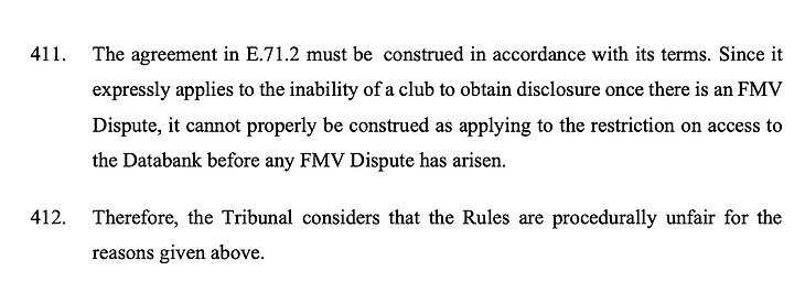 В пункте 412 комиссия признает, что правила АРТ процессуально нечестны с точки зрения того, что у команд нет возможности знать ход рассмотрений третьим регулировщиком (компанией Nielsen и отделом АПЛ, занимающимся финансовыми оценками) до момента их постановления.