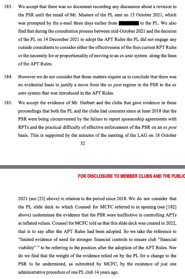 Комиссия говорит о том (пункт 183), что, действительно, как верно подметила сторона Сити, до октября 2021 года не было никаких обсуждений о том, что действующий свод правил требует изменений, мол он где-то не справляется со своими задачами. Также, комиссия постанавливает, что не было консультаций между Премьер-лигой и независимыми юридическими фирмами на тему того, насколько текущие правила нуждаются в поправках.