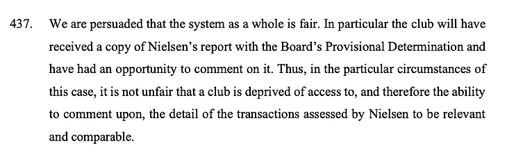 В пункте 437 комиссия говорит, что она убеждена в том, что система в целом является честной. В целом, клубам будет предоставлен отчет компании Nielsen по оценке спонсорского контракта, вместе с ответом от АПЛ, а так же им предоставлена возможность отвечать на этот итог.