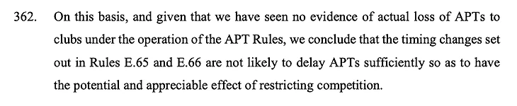 В предшествующих этому пункту комиссия исследовала влияние старых пунктов APT на соревнования. Одной из опор стороны Сити был факт того, что до 25% сделок, связанных с ассоциированными компаниями, занимали от 25 дней и более. Однако, комиссия постановила, что, как бы печальны ни были эти задержки, они не влияли на факт того, что сами сделки из-за этого срывались. Соответственно, комиссия не видит действительной соревновательной помехи.