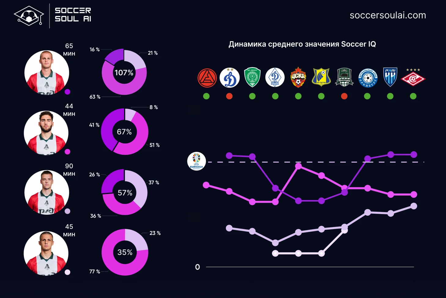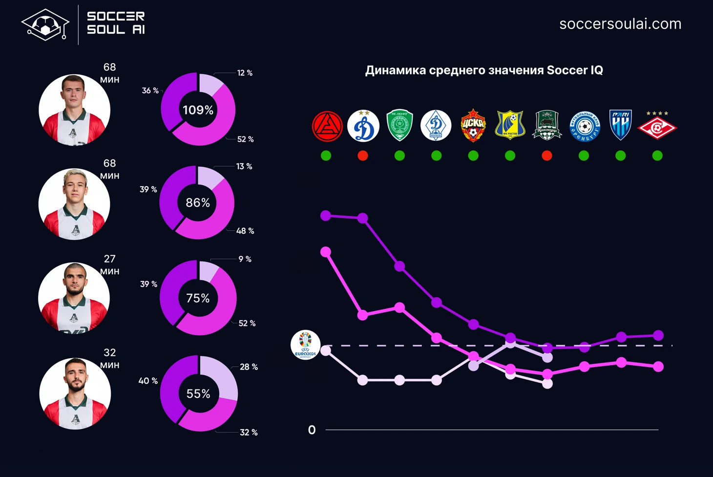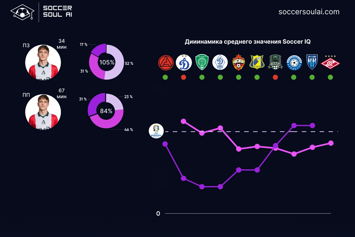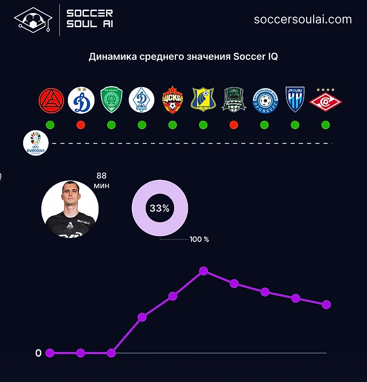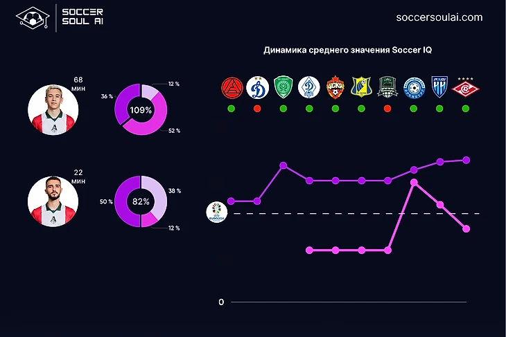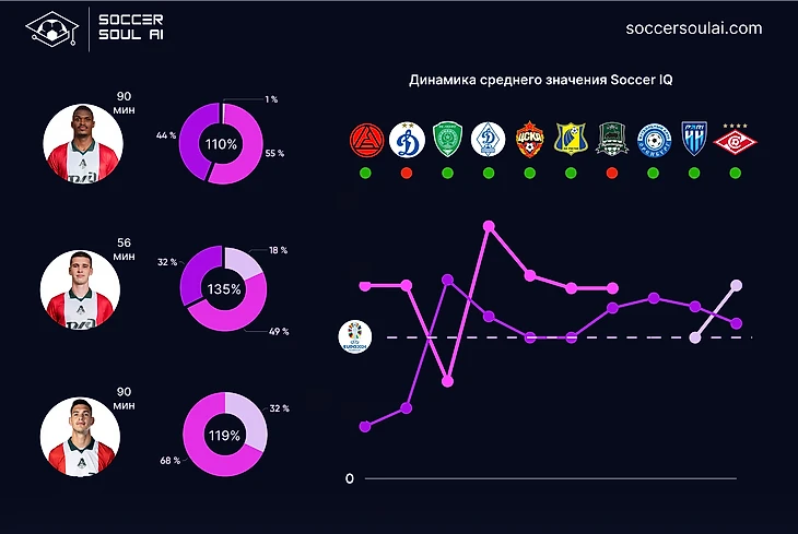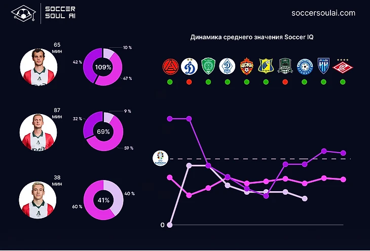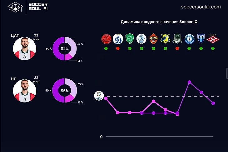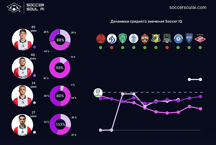 С точки зрения игровых позиций (в формате 1-4-2-3-1) регулярно демонстрируют SoccerIQ выше 100% центральные защитники и атакующие полузащитники (за счет вклада Батракова).