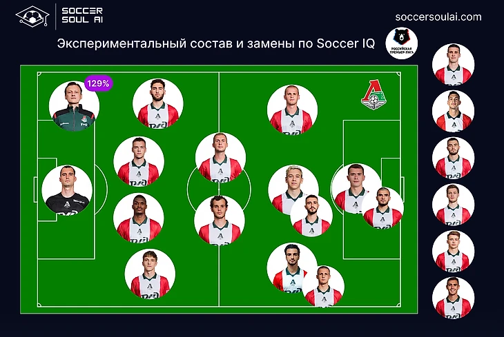 С учетом завершённого анализа, сформирован стартовый состав команды с рекомендуемыми усилениями, позволяющий Локомотиву с определённым запасом преодолевать планку в Soccer IQ 118%, которая даёт вероятность завершения матча победным исходом в 100% случаев, вне зависимости от показателя второй ключевой метрики – эффективности продвижения. Запас по метрике Soccer IQ даёт возможность экспериментов с предоставлением игрового времени резервным футболистам и тестированием синергии показателей между не часто играющими вместе игроками.