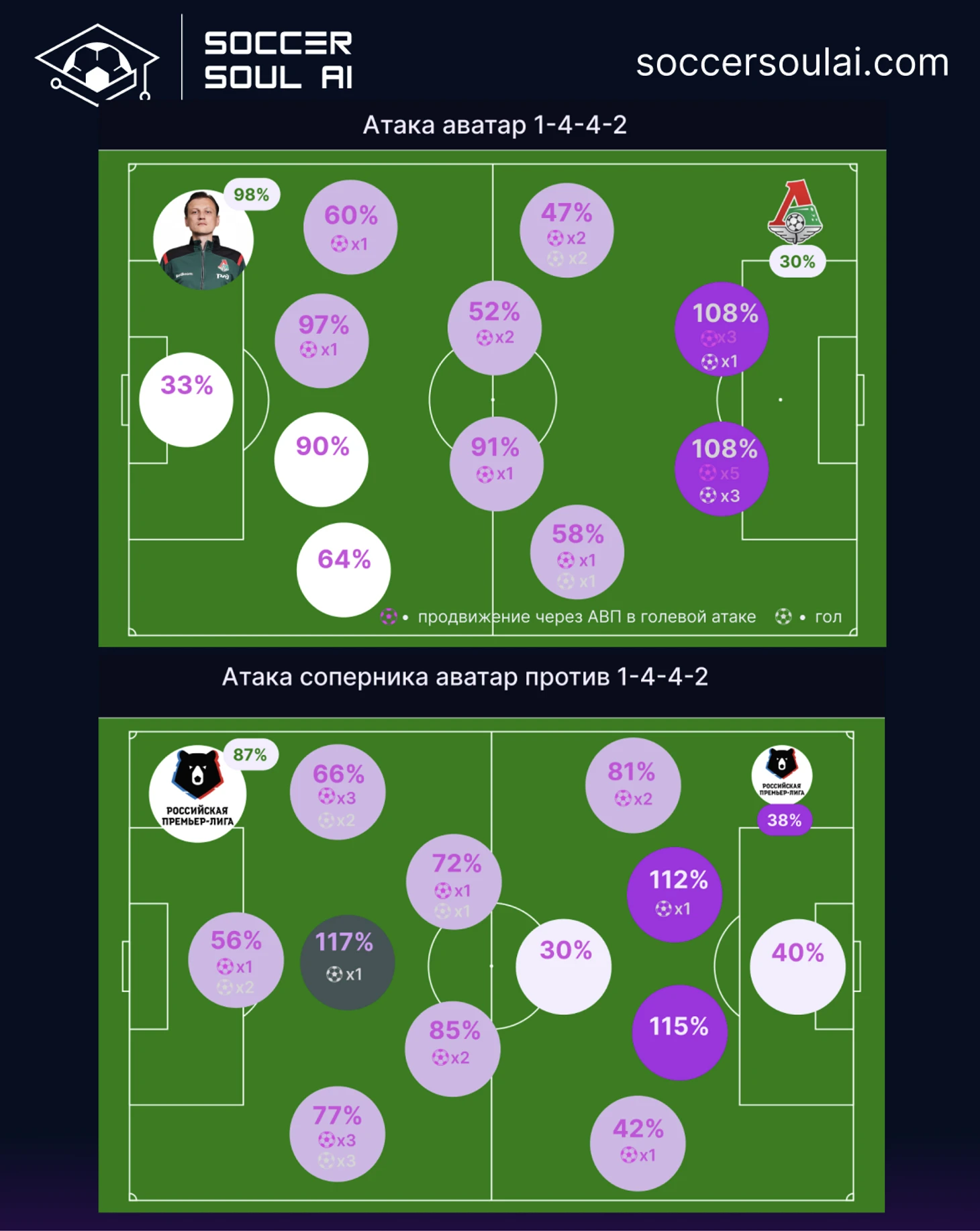 Против 1-4-4-2 у соперников сильно смотрелся центр обороны и не часто появлявшийся центральный атакующий полузащитик. В целом, в такой игровой формации Локомотиву было очень сложно противостоять эффективности продвижения мяча соперником, которая составила 38%!