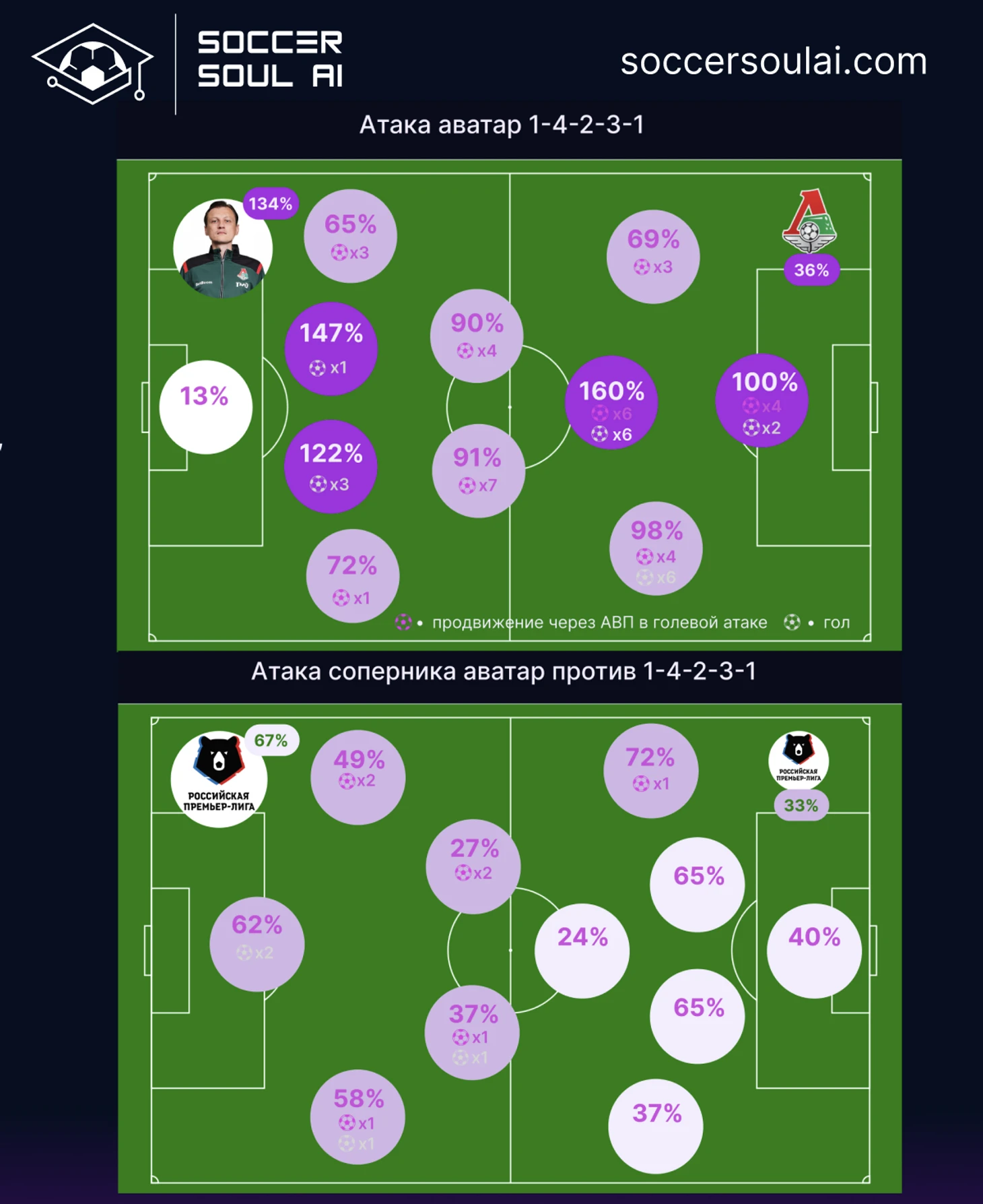 У соперника в противодействии чаще преобладала 1-4-3-3, против которой в прямом сопоставлении баланса по позициям, Локомотива проигрывал на флангах (исключение – позиция правого полузащитника).
