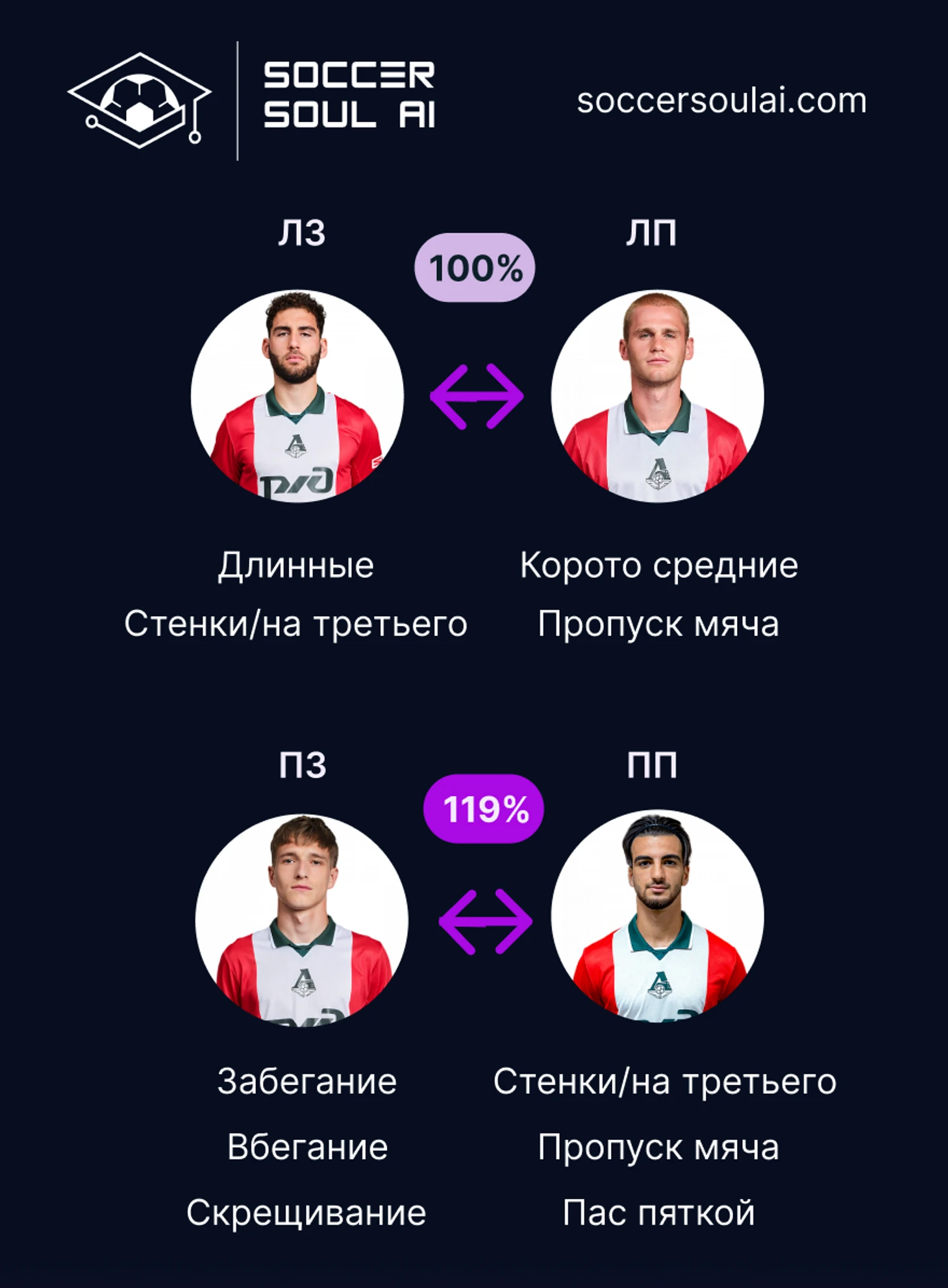 Сравнивая рекомендуемые фланговые связки, отметим, что гипотетически синергия от действий Самошникова и Севикяна будет выше, чем у Тикнизяна и Пиняева. Однако, в отличие от правофланговой пары, в прошедших матчах игроки слева уже имели между собой успешные взаимодействия, а именно трижды Тикнизян выводил Пиняева на ударную позицию, дважды посредством коротко-средних передач и однажды – стенкой на третьего.