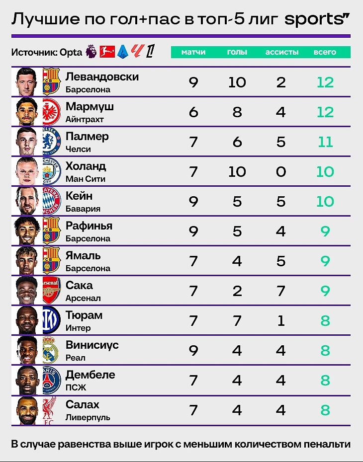 ● В топе сразу три игрока «Барселоны»: у Роберта Левандовского, Рафиньи и Ламина Ямаля 19 голов и 11 ассистов на троих.