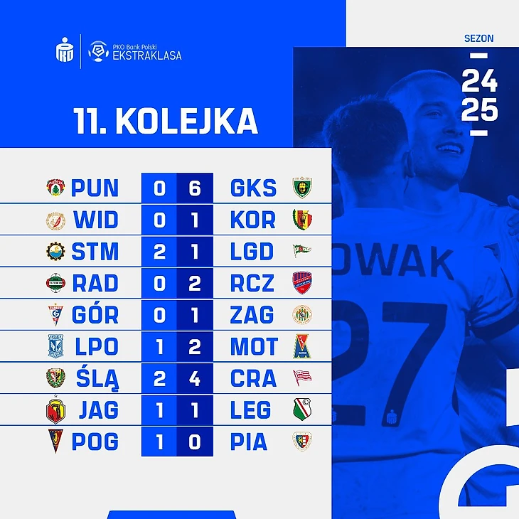 Одиннадцатый тур Экстракласы преподнес несколько неожиданных результатов. Главную сенсацию преподнес «Мотор», который увез три очка из Познаня, где еще никто в сезоне не набирал очки, катовицкий «ГКС» разбил «Пущу» с теннисным счетом, а Марк Гуал огорчил бывшую команду, сумев спасти «Легию» от поражения.