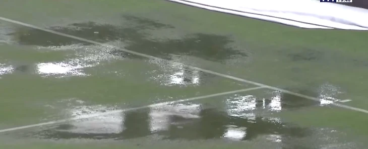 Сильный ливень превратил поле в непригодное. Мяч не прыгал и не катился, но игру переносить не стали.
