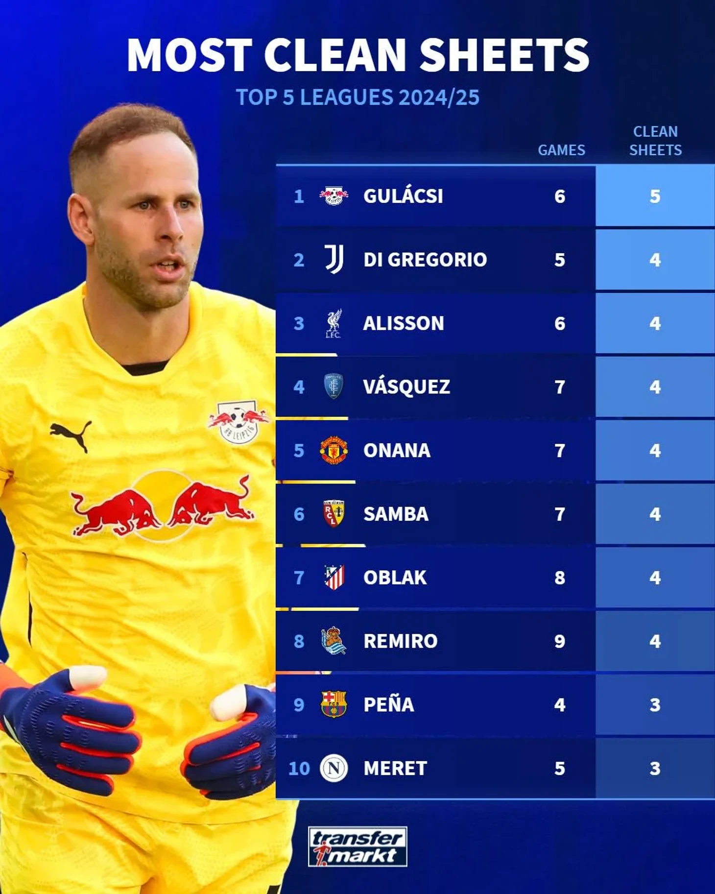 Первое место у венгра Петера Гулачи из «РБ Лейпцига». Команда идет на втором месте, пропустив «Баварию» на первое лишь по дополнительным показателям. В шести турах Бундеслиги у Гулачи всего два пропущенных мяча и пять сухих игры.