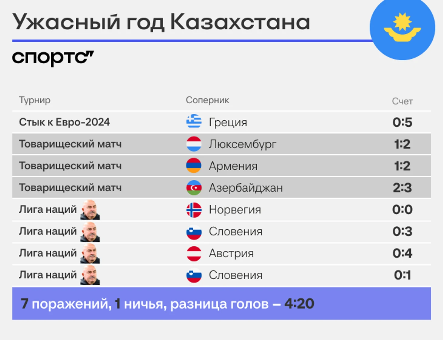 Российский тренер начал в Казахстане без голов в четырех матчах, но одно очко и разница мячей 0:8 – не худший старт в истории сборной. На том же уровне в 2017-м был Александр Бородюк, он так и не доработал до первой победы, уволили после шести поражений в семи матчах.