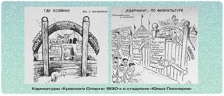 Статья «Где хозяин?» из «Красного Спорта» от 9 марта 1934 г. приоткрывает для нас завесу тайны об этом плачевном состоянии стадиона. «Пищевики», узнав о том, что стадион хотят полностью отдать школьникам, поспешили покинуть это место, захватив с собой часть инвентаря и тренеров-физкультурников. Так стадион оказался практически бесхозным, в эдаком подвешенном состоянии – «пищевики» уже от него открестились, а нового настоящего хозяина еще не появилось. Здесь же упоминается о том, что на стадионе рухнуло здание ремонтной мастерской, что мастерски запечатлел художник на колкой карикатуре, прилагаемой к статье.