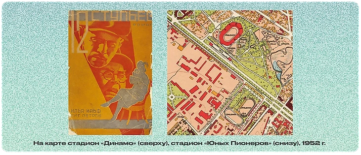 Однако, если мы откроем более поздние версии романа, то увидим, что велосипедисты летят уже с совсем другого стадиона – «со стадиона Юных Пионеров». В 1930-х годах стадион действительно стал носить новое название и сменил свою ориентацию на развитие детско-юношеского спорта. М.П. Томский попал под каток сталинских политических решений и покончил жизнь самоубийством, узнав о своем обвинении в контрреволюционной деятельности. Не удивительно, что его имя исчезает и со страниц романа. Так, несмотря на очевидный анахронизм, в тексте появляется название стадиона, которое он приобрел спустя несколько лет после похождений Бендера и Воробьянинова.