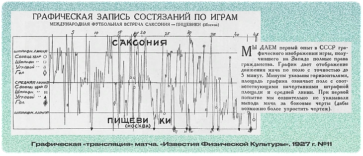 Первый артефакт появился благодаря журналистам газеты «Известия Физической Культуры». Они явили на свет первую в отечественном футболе графическую запись матча. В наш «xG-век» рассматривать такую подробную «аналоговую» статистику игры – одно удовольствие.