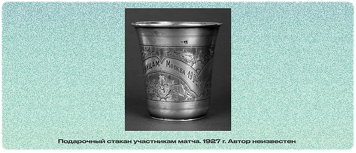 Автора второго артефакта установить не удалось, но вся немецкая делегация получила после матча памятные серебряные стаканы с гравировкой. На стаканах умелой рукой неизвестного кустаря выгравирован узор и надпись «Саксонцам. Москва 22.V.27». На интернет-форумах можно найти информацию, что относительно недавно стаканы были замечены в одном из антикварных магазинов Германии.