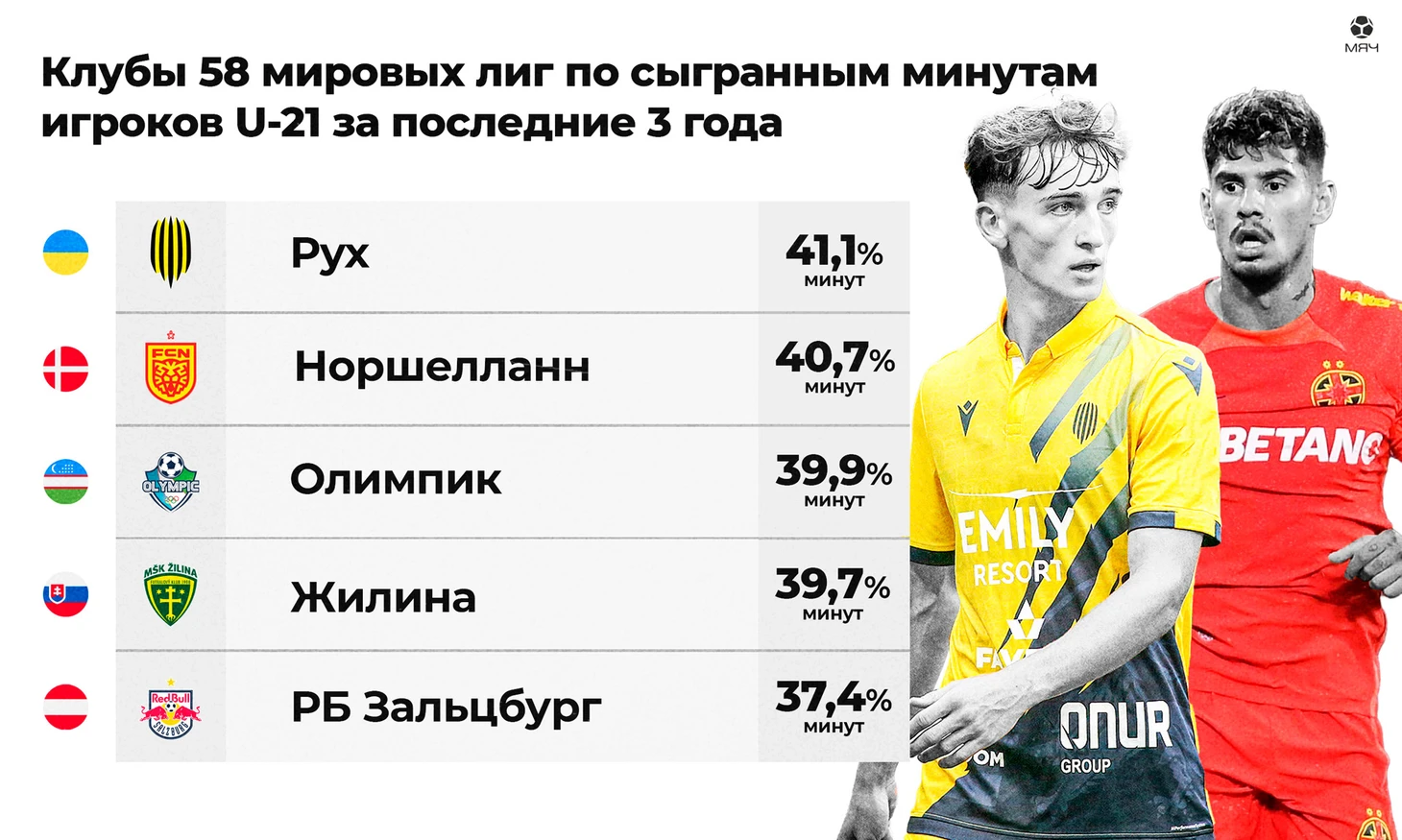 Но CIES сделали такой рейтинг не только для клубов топ-чемпионатов, а для 58 лиг по всему миру. И вот среди всех этих команд на первом месте идет украинский «Рух» – у которого аж 41,1% времени играют футболисты не старше 21 года. И почти такой же результат у узбекского «Олимпика» (39,9%). Круто, что и в постсоветских странах есть клубы, делающие ставку на молодежь!