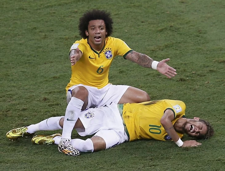Бразилец стал лидером сборной на чемпионате мира 2014 года. В четвертьфинальном матче против Колумбии на 80-й минуте он получил коленом от Суньиги в спину. Неймара унесли на носилках после перелома поясничного позвонка. В конце концов ему удалось избежать операции, но он пропустил полтора месяца. После выздоровления Неймар продолжал бить рекорды, как в «Барселоне», так и в «ПСЖ».