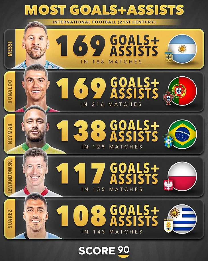 Лео Месси оформил 3+2 в матче с Боливией (6:0) и догнал Криштиану Роналду по голевым действиям за сборную (у обоих по 169). Аргентинец и португалец – лидеры своих команд в 21 веке. В топ-5 также Неймар, Роберт Левандовски и Луис Суарес.
