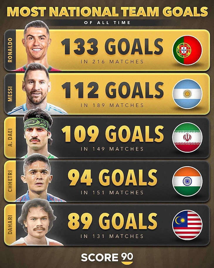 А вот по голам Месси еще далеко до Роналду – 21 мяч. Зато теперь Лео вышел на второе место по голам за сборную за всю историю футбола, обогнав Алеи Даеи, завершившего карьеру в 2007-м. Об остальных в этом списке вы вряд ли много слышали.