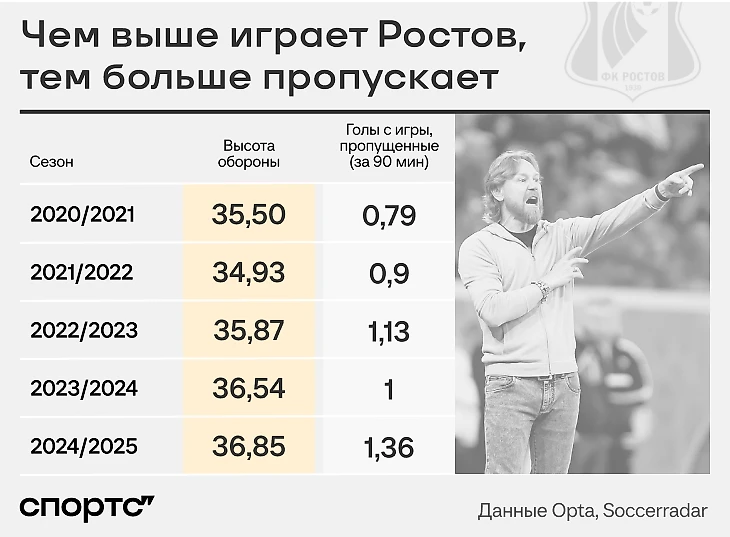 С каждым сезоном Карпин стремится играть без мяча агрессивнее, но защитники «Ростова» не всегда готовы выдерживать высокую линию, поэтому чаще ошибаются при забросах за спину.