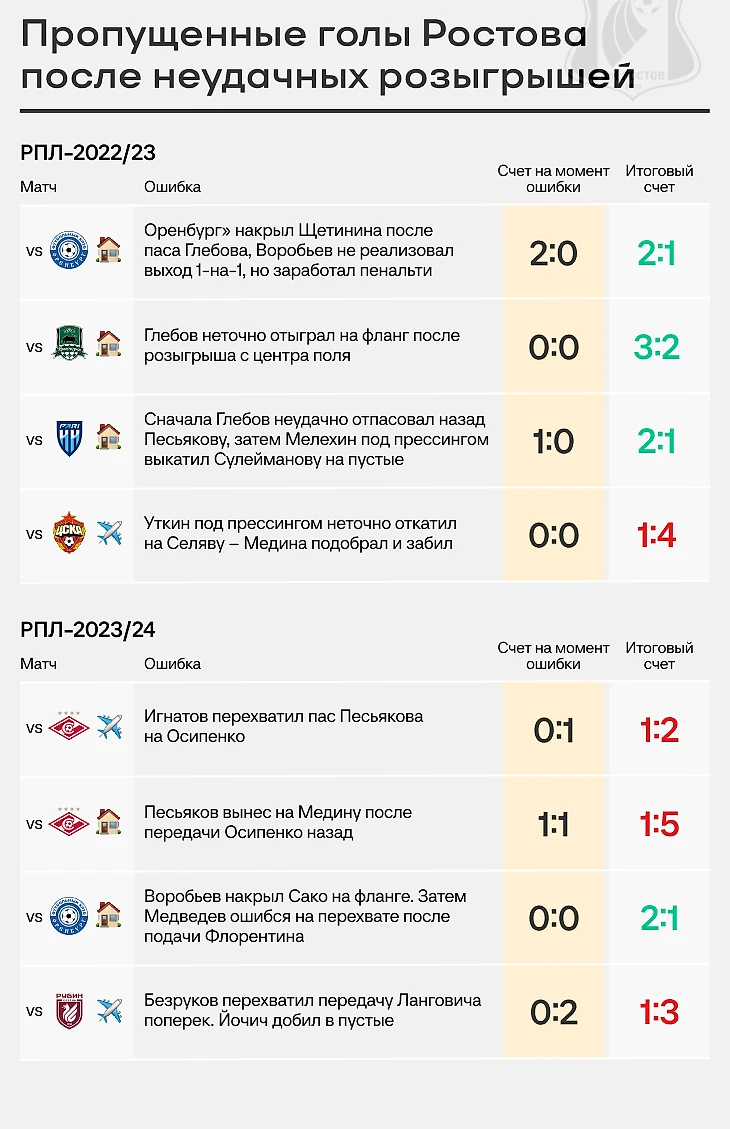 В этом сезоне «Ростов» пропустил дважды из-за потерь при выходе из-под прессинга. В матче с «Локомотивом» Андрей Лангович фактически ассистировал Алексею Батракову, а в последнем туре Наиль Умяров хитро накрыл Данила Глебова после паса от вратаря Даниила Одоевского.