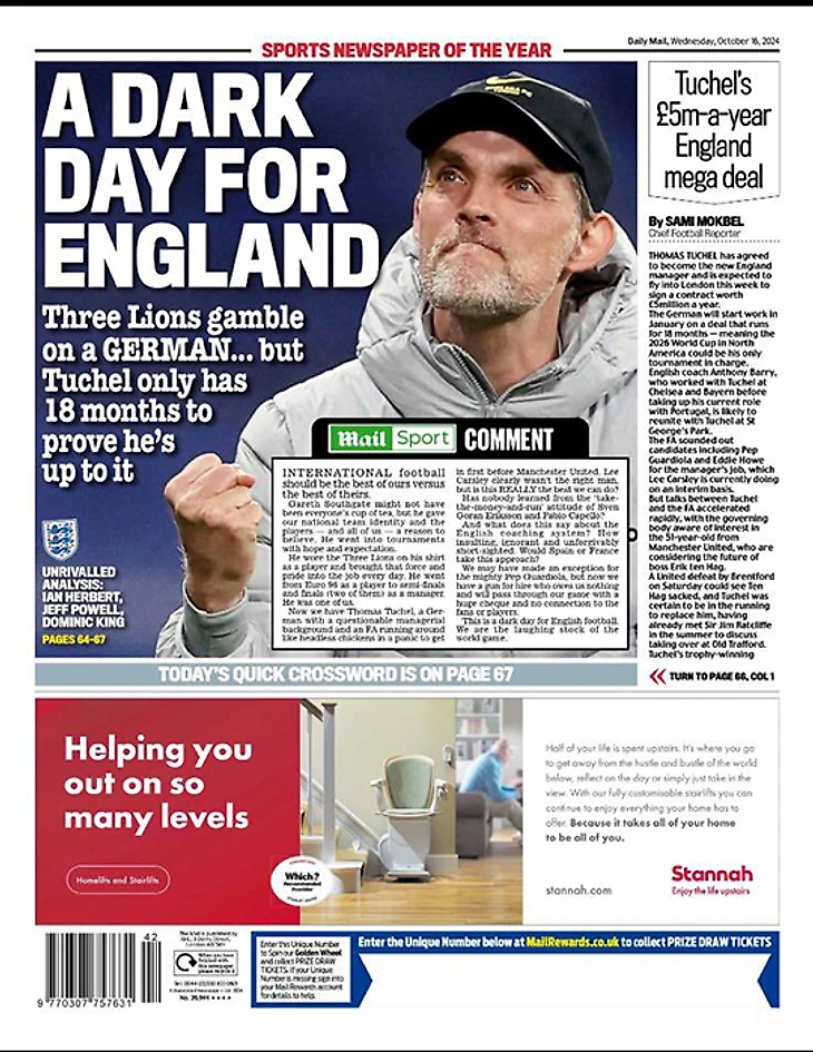 Сэм Уоллес из The Telegraph в ту же сторону − в тексте с понятным названием «Почему Томас Тухель не должен быть тренером сборной Англии» автор пишет: «Мы бросаемся деньгами в зарубежных талантов − сводит международную игру к имитации клубного футбола. ФА должна была нанять английского тренера».