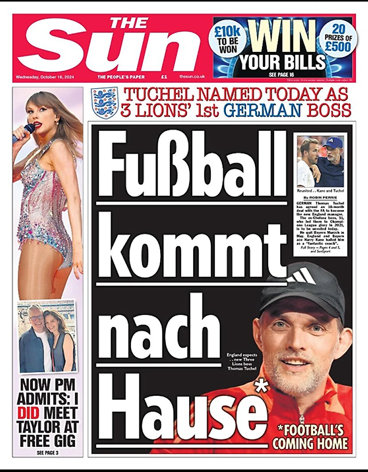 The Sun – фото Тухеля на черном фоне, надпись на немецком: «Футбол возвращается домой».