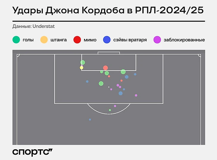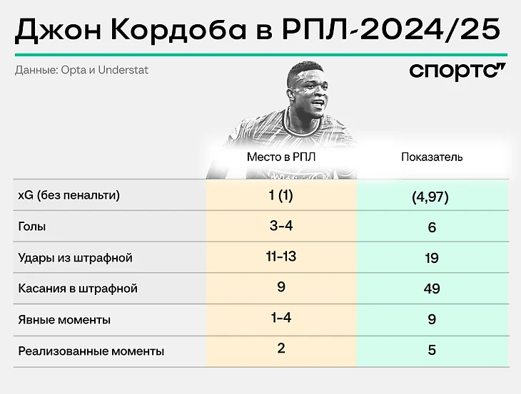 2. Кордобе требуется всего 67 минут на результативное действие в РПЛ. Обычно мы используем статистику в пересчете на 90 минут, но оцените суммарные данные: пропустивший четыре матча Кордоба лидирует по ожидаемым голам (сыграл 604 минуты, ближайшие преследователи – более 950), в топе по явным моментам, догоняет конкурентов по ударам и касаниям в штрафной.