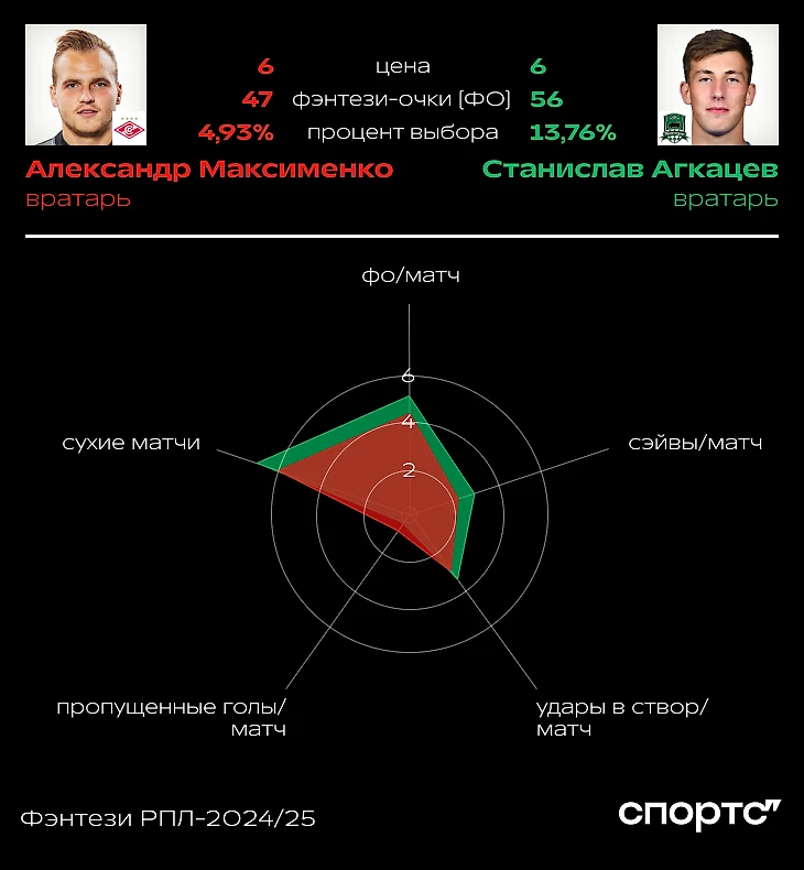 По фэнтези-очкам Александр Максименко 4-й среди вратарей (47), а вот процент выбора у него крайне низкий (4,88%) – легко объяснить большей популярностью других игроков «Спартака». У Александра шесть сухих матчей в 11 турах, больше только у Евгения Латышонка (8) и как раз Станислава Агкацева (7).