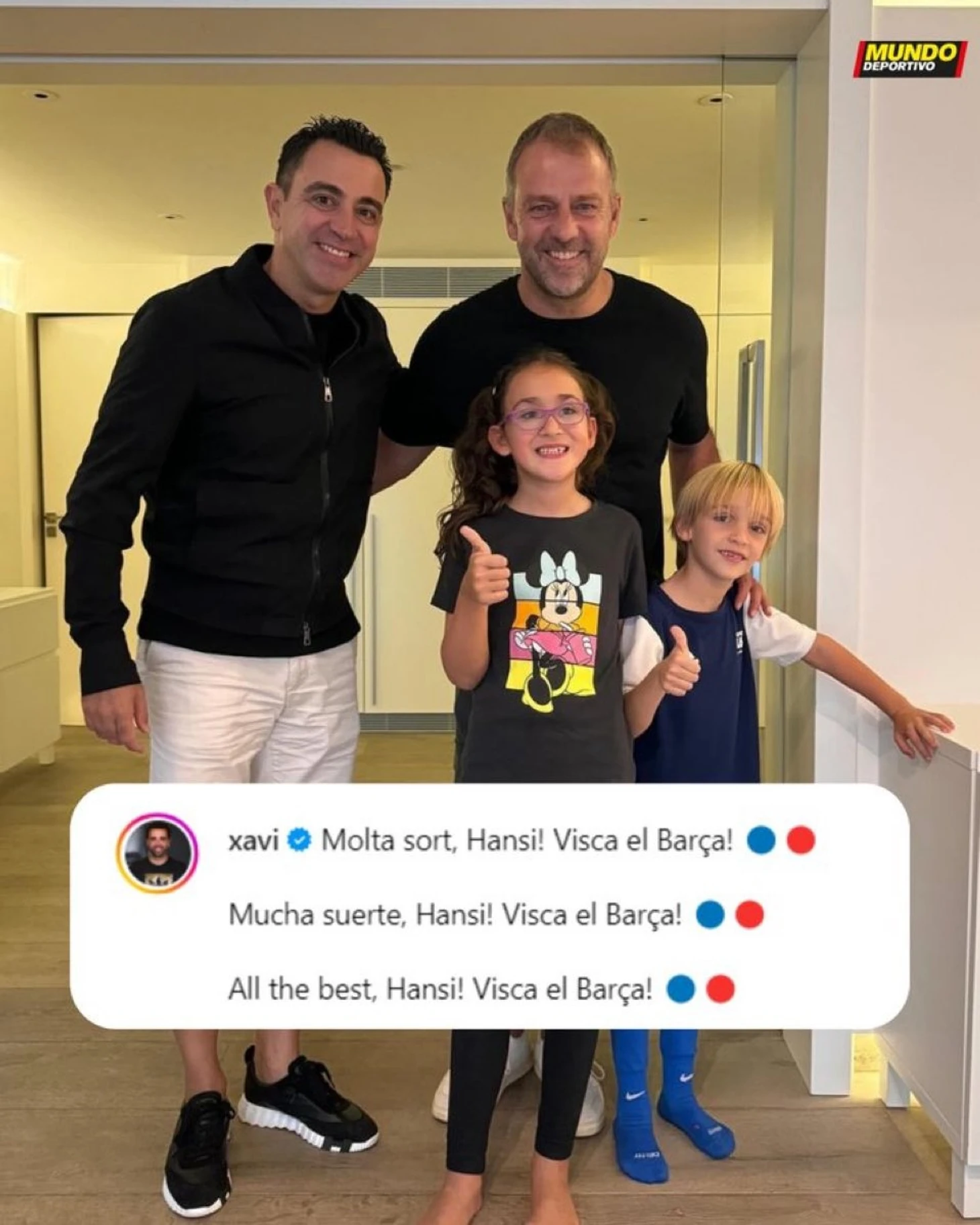 Хави поделился фотографией со своими детьми и Фликом, подписав на трех языках: «Удачи, Ханси! Visca el Barça!»