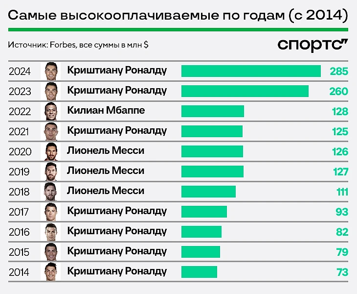 Лионель Месси – все еще самый зарабатывающий вне поля. Но суммарно Роналду отрывается дальше: в прошлом году сделал 200+60, в этом на 25 млн больше.