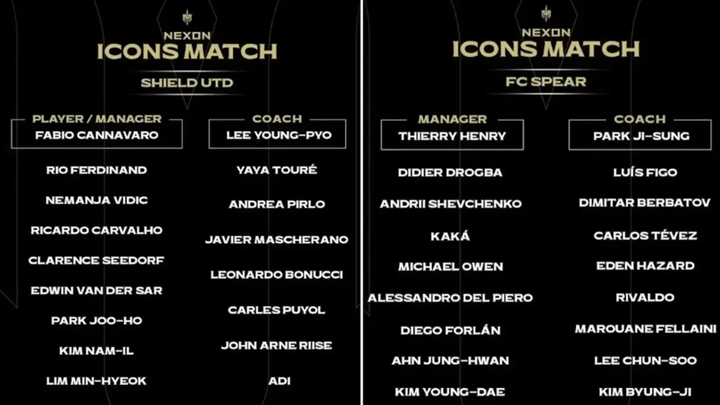 Организаторы создали два коллектива, которые получили названия: Spear (копье) и Shield (щит). В первую команду набирали исключительно игроков атаки, в другую попали только защитники. Первых тренируют Тьерри Анри и Пак Чжи Сун, вторых – Фабио Каннаваро и Ли Юн Пе. Очень оригинальная идея.