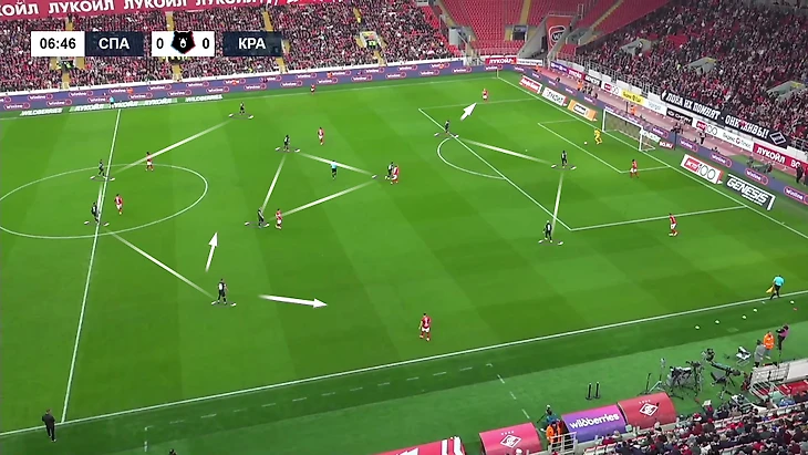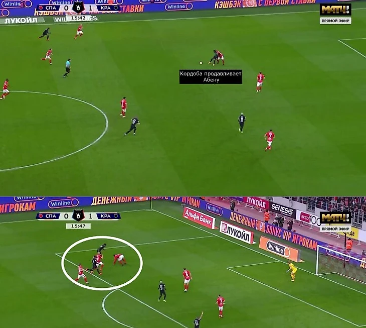 3-5-2 «Спартака» краснодарцы разбиралилегко»: Кордоба и Са давили разыгрывающих, Жоау Баши ориентировался на уходящего левее Бабича, середина играла один в один, крайние защитники смотрели за Маркиньосом и Олегом Рябчуком, центральные защитники играли по двум нападающим.