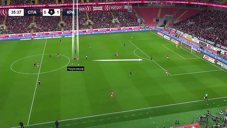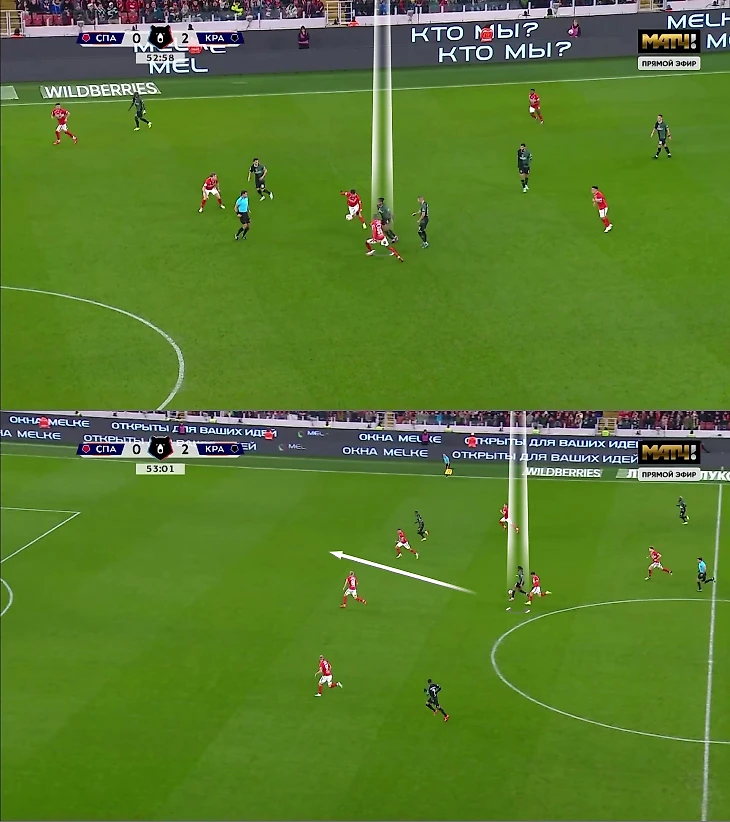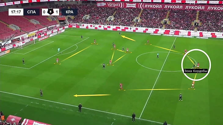 Во-вторых, «Краснодар» классно растягивал центр поля «Спартака»: из-за рывков полузащитников вниз туда уходила и опорная зона. В итоге Кордоба, спускаясь ниже, оказывался на большом пространстве, это усиливало эффект.